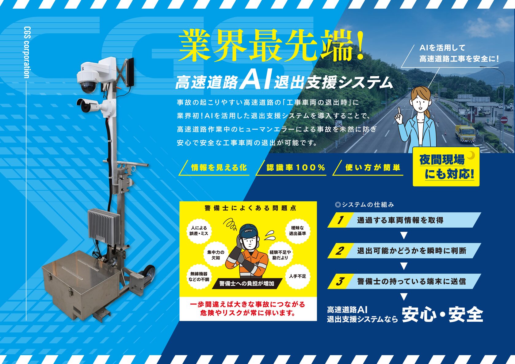 CGSコーポレーションは、事故の起こりやすい高速道路の「工事車両の退出時」に業界初となるAIを活用した退出支援システムを導入することで、高速道路作業中のヒューマンエラーによる事故を未然に防ぎ、安心で安全な工事車両の退出を可能とした「高速道路AI退出支援システム」を2023年8月に開発いたしました。