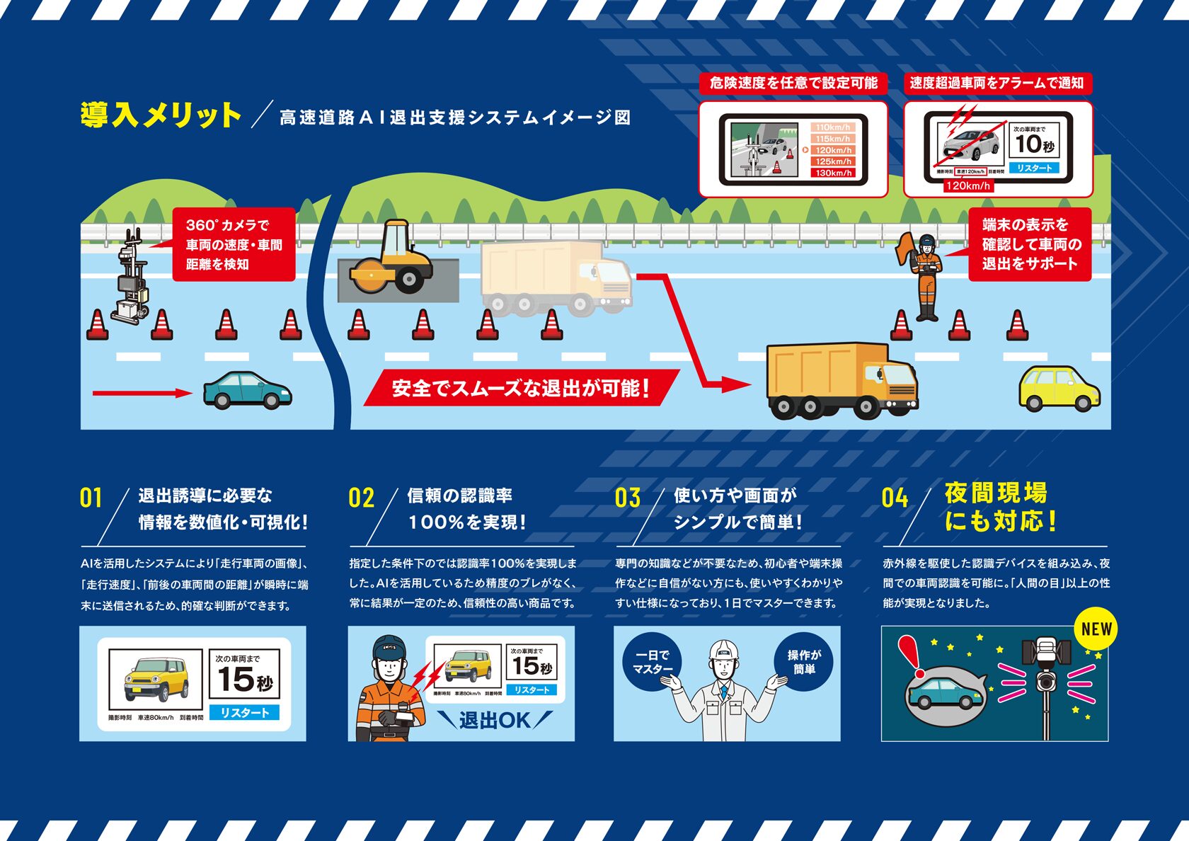 弊社が開発した「高速道路AI退出支援システム」とは、高速道路上の工事現場から走行車線へ退出を行う工事関係車両の退出支援システムです。