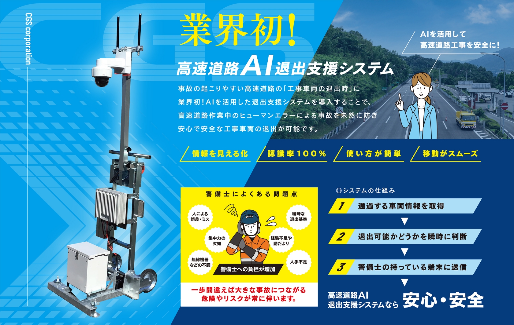 CGSコーポレーションは、事故の起こりやすい高速道路の「工事車両の退出時」に業界初となるAIを活用した退出支援システムを導入することで、高速道路作業中のヒューマンエラーによる事故を未然に防ぎ、安心で安全な工事車両の退出を可能とした「高速道路AI退出支援システム」を2023年8月に開発いたしました。