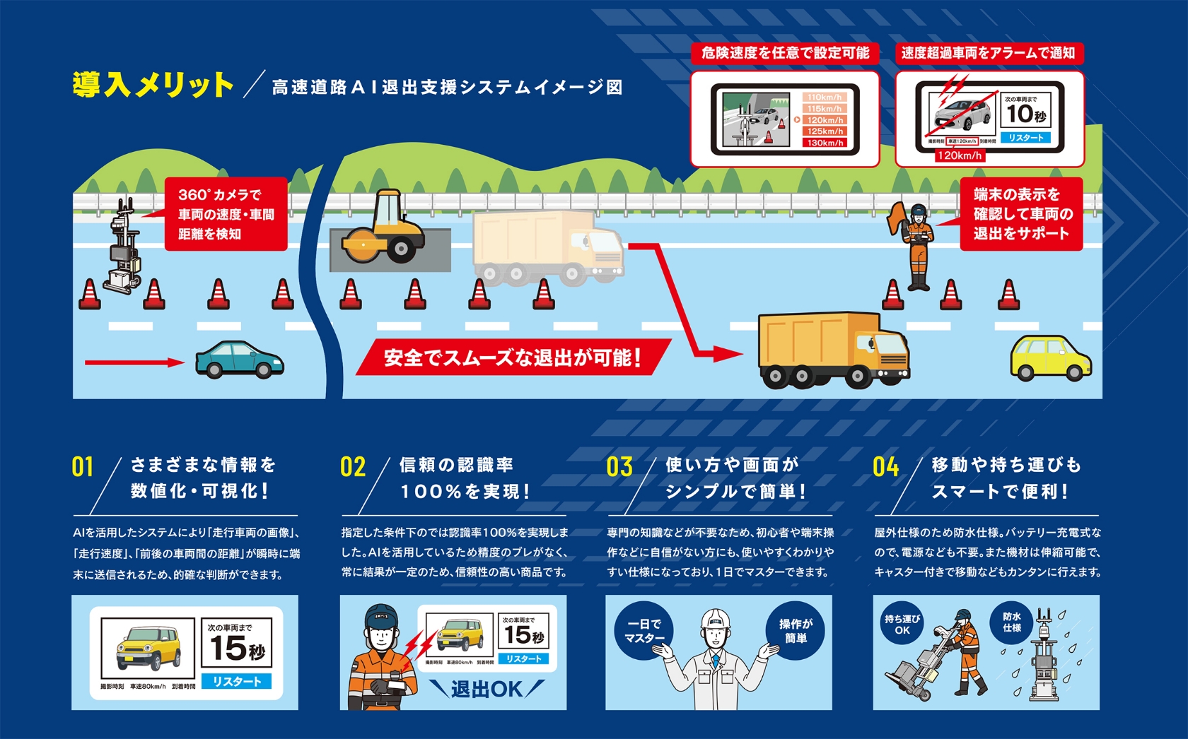 弊社が開発した「高速道路AI退出支援システム」とは、高速道路上の工事現場から走行車線へ退出を行う工事関係車両の退出支援システムです。